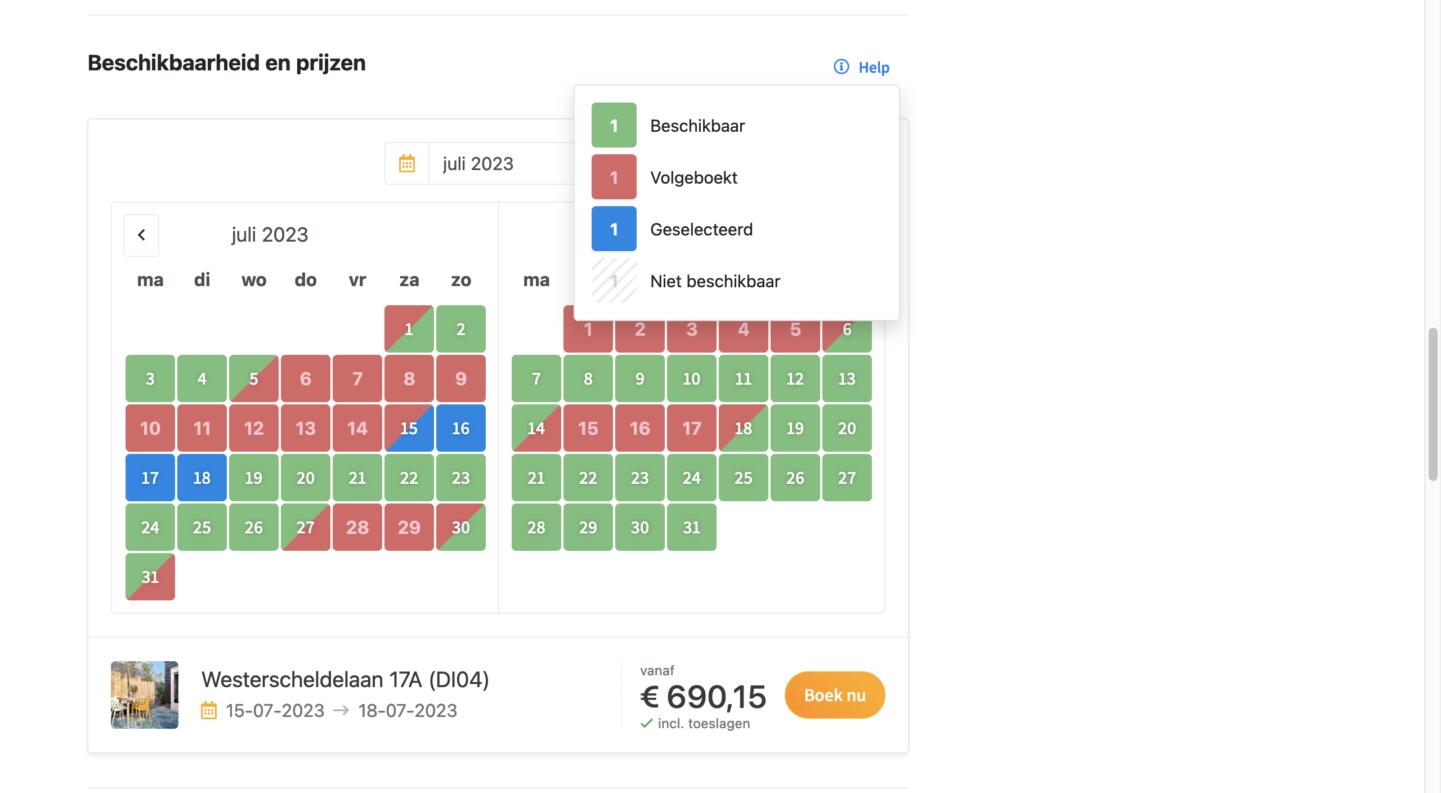 To further clarify the search & book, a legend has been added that explains the different colors in the calendar. This way, there can be no ambiguity about the availability of an accommodation under any circumstances. Although the colors speak for themselves, the legend further confirms that: