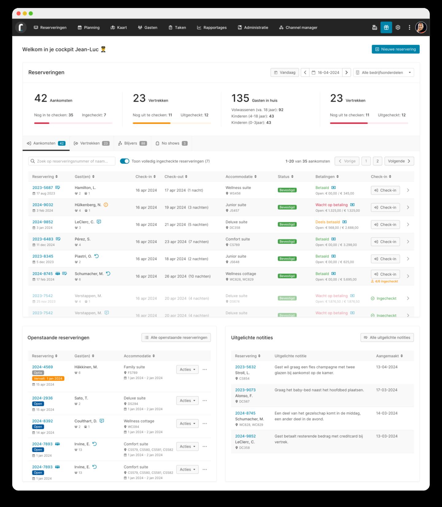 From the new cockpit you also have a direct view of the still open or unread reservations, those that have recently arrived and thus still need to be confirmed or reviewed. Reservations in option are shown on a separate tab, so you can keep an overview compared to the final reservations. If highlighted notes have been created for reservations, they are also visible from the cockpit, so you can take the necessary action or make preparations as needed. Super convenient to start the day from your new cockpit and see at a glance what awaits you that day!
