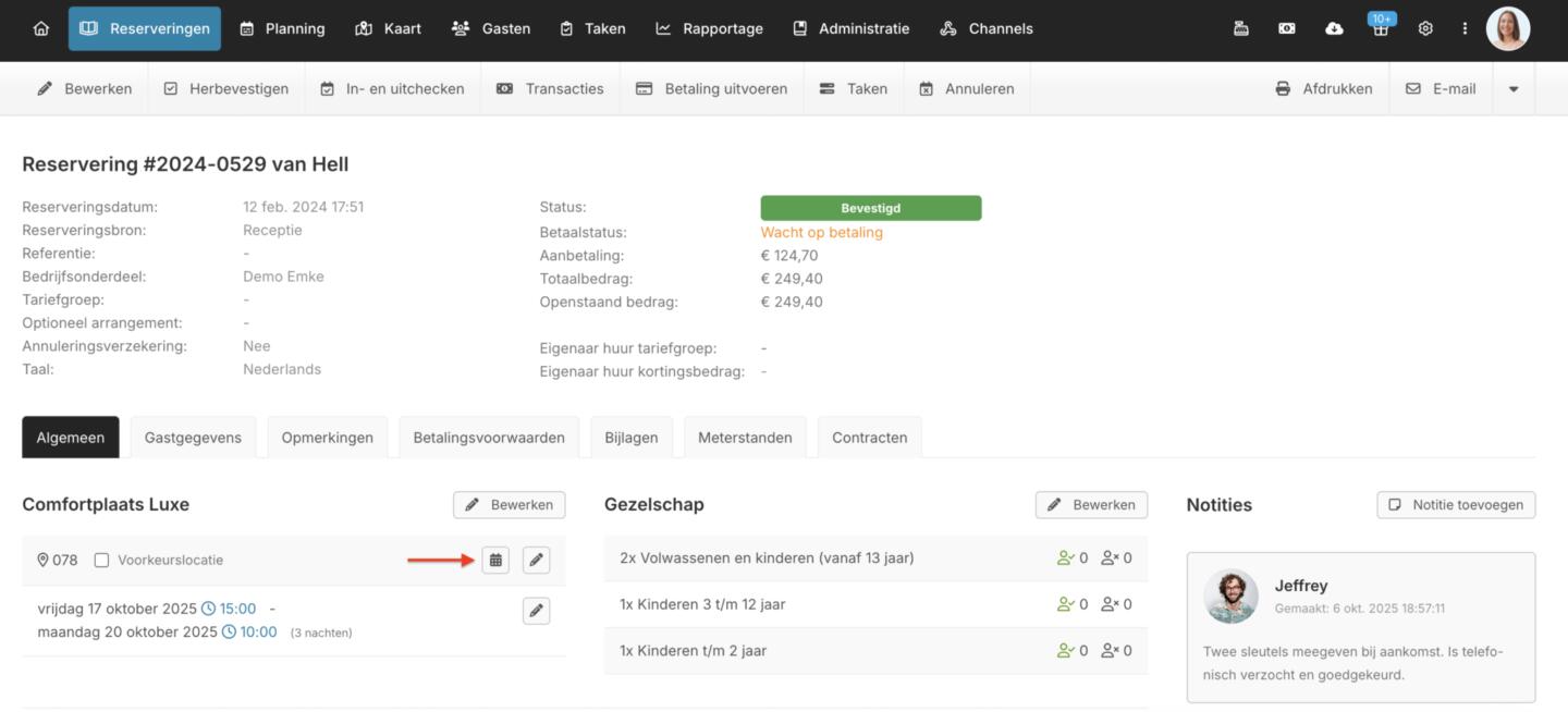 It is now possible to go directly from the reservation card to the corresponding spot on the schedule! This is very useful if you want to view the reservation from the overview on the planning board. When you click on the calendar icon, the reservation system takes the period of stay and booked location and searches for it on the schedule, after which the relevant reservation is highlighted among all other reservations.