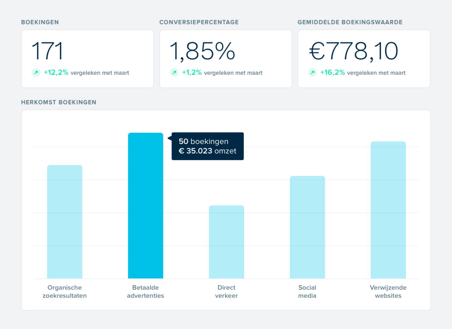 Alle lopende campagnes worden maandelijks grondig geëvalueerd en continue bijgestuurd, dit doen we op basis van data die rechtstreeks uit de website en ons reserveringssysteem komt. Zo passen we slimme e-commerce tracking toe op de website en de zoek-en-boek van ons reserveringssysteem. Hiermee geven we 24/7 en realtime inzicht in de prestaties van onze marketing. Zo krijgen ze transparant inzicht in wat de investering in online marketing ook echt oplevert.