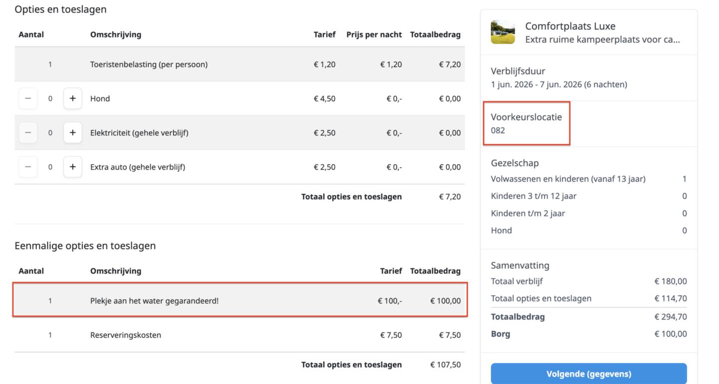 Met deze update kun je toeslagen koppelen aan locatie kenmerken binnen je reserveringssysteem. Denk aan kenmerken zoals 'laadpaal aanwezig' of 'extra ruime plaats'. Wanneer een gast online een locatie selecteert met een specifiek kenmerk, wordt de bijhorende toeslag automatisch getoond en toegevoegd aan de boeking.