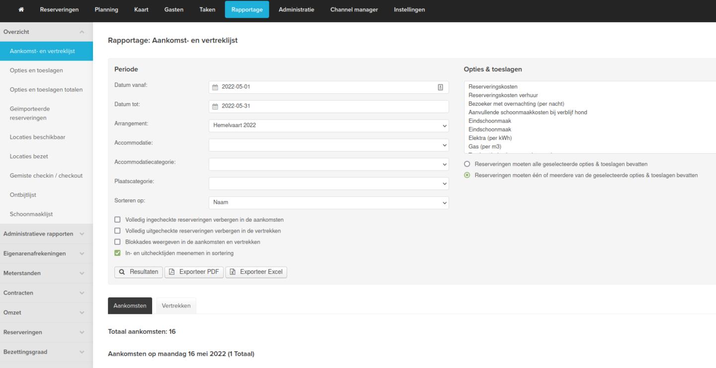 In ons reserveringssysteem is het nu mogelijk om de aankomst- en vertreklijst te filteren op arrangementen. Op deze manier kan er met één druk op de knop een rapportage gegenereerd worden van alle aankomsten en vertrekken binnen een specifiek arrangement. Het is handig om in kaart te brengen welke gasten er bijvoorbeeld rond Pasen zijn geweest of juist met Kerst. Als camping kun je ook gemakkelijk seizoensplaatsen en jaarplaatsen uitfilteren, zodat je ze allemaal in één overzicht onder elkaar hebt staan.