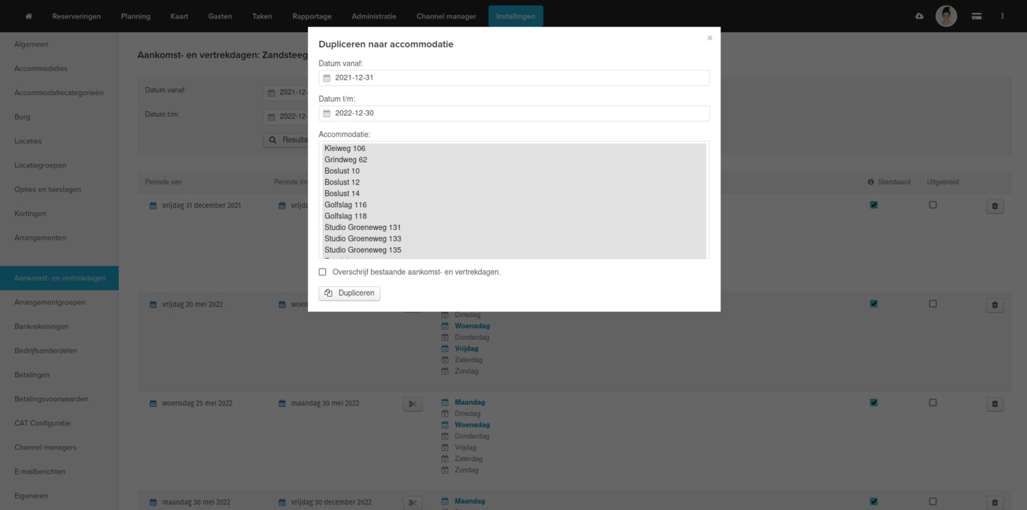 In ons online reserveringssysteem is het nu mogelijk om accommodatie aankomst- en vertrektijden te dupliceren. Dit scheelt erg veel tijd wanneer meerdere accommodaties aankomst- en vertrektijden veranderd moeten worden. Ook is het eventueel mogelijk om de bestaande aankomst- en vertrektijden te overschrijven.
