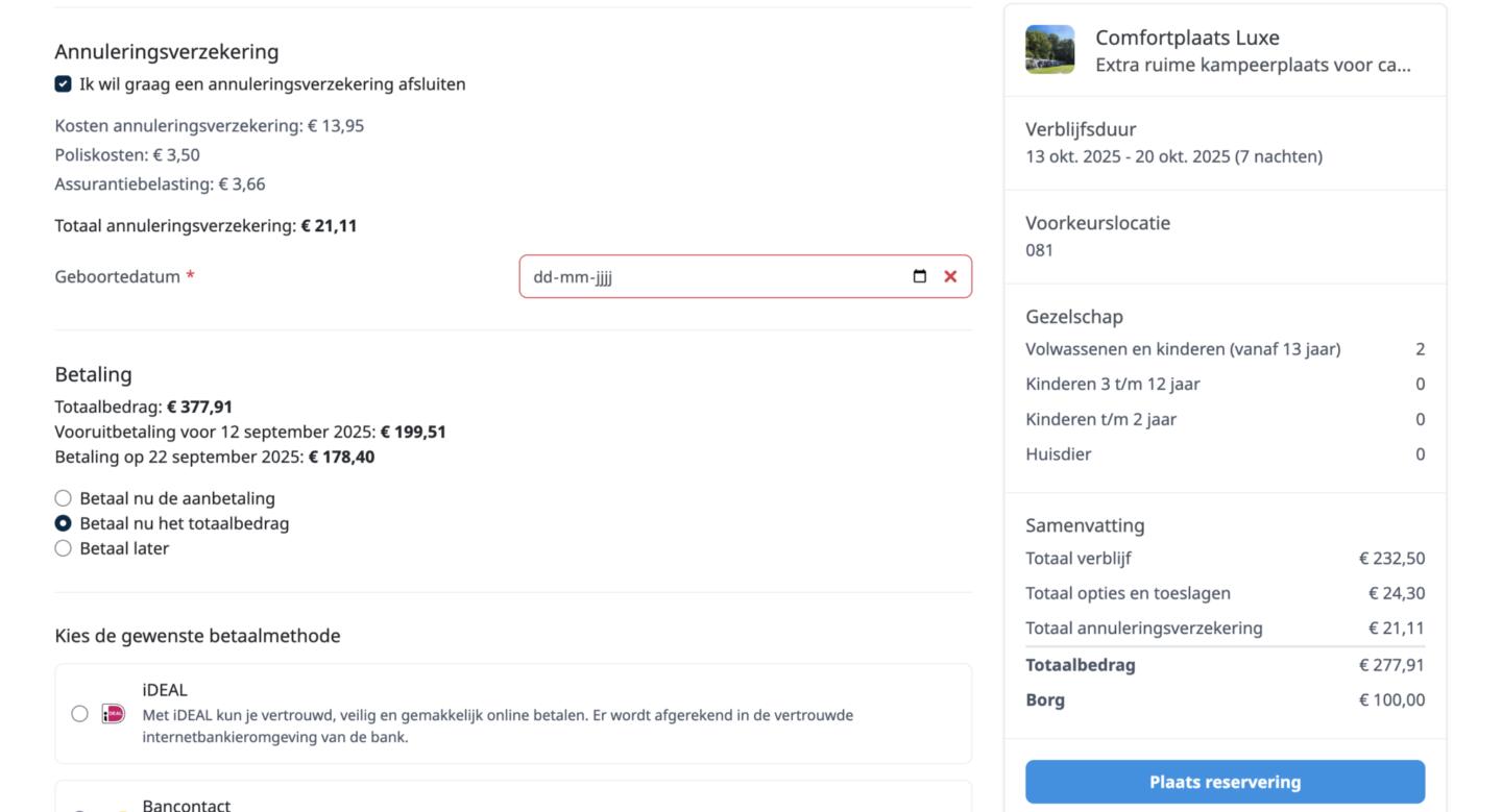 De geboortedatum wordt alleen opgevraagd wanneer de verzekering wordt aangevinkt. Zo voorkom je dat deze informatie standaard verplicht is bij iedere reservering. Deze update zorgt voor een correcte gegevensverwerking voor de annuleringsverzekering, zonder dat het boekingsproces voor andere gasten onnodig wordt vertraagd.