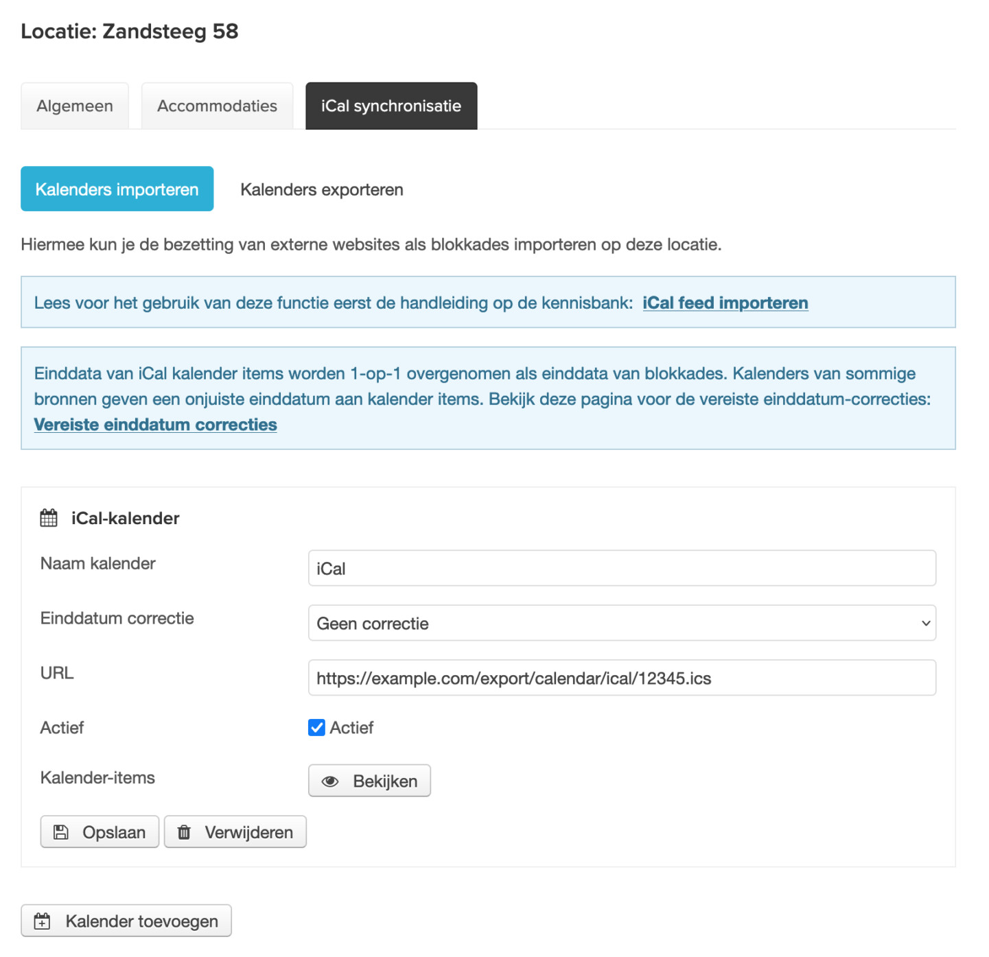 De iCal-feeds op accommodatie-niveau geven de totale bezetting weer van alle locaties die gekoppeld zijn aan de gekozen accommodatie. De iCal-export functionaliteit is hiermee beter geschikt gemaakt voor het maken van iCal-koppelingen voor grote aantallen accommodaties. De iCal-feed op accommodatie-niveau kan bijvoorbeeld goed toegepast worden voor het maken van iCal-koppelingen voor kampeerplaatsen of bungalows. Wanneer je één groep kampeerplaatsen of bungalows verhuurt van hetzelfde type, kun je nu de iCal-export instellen voor alle eenheden tegelijk.