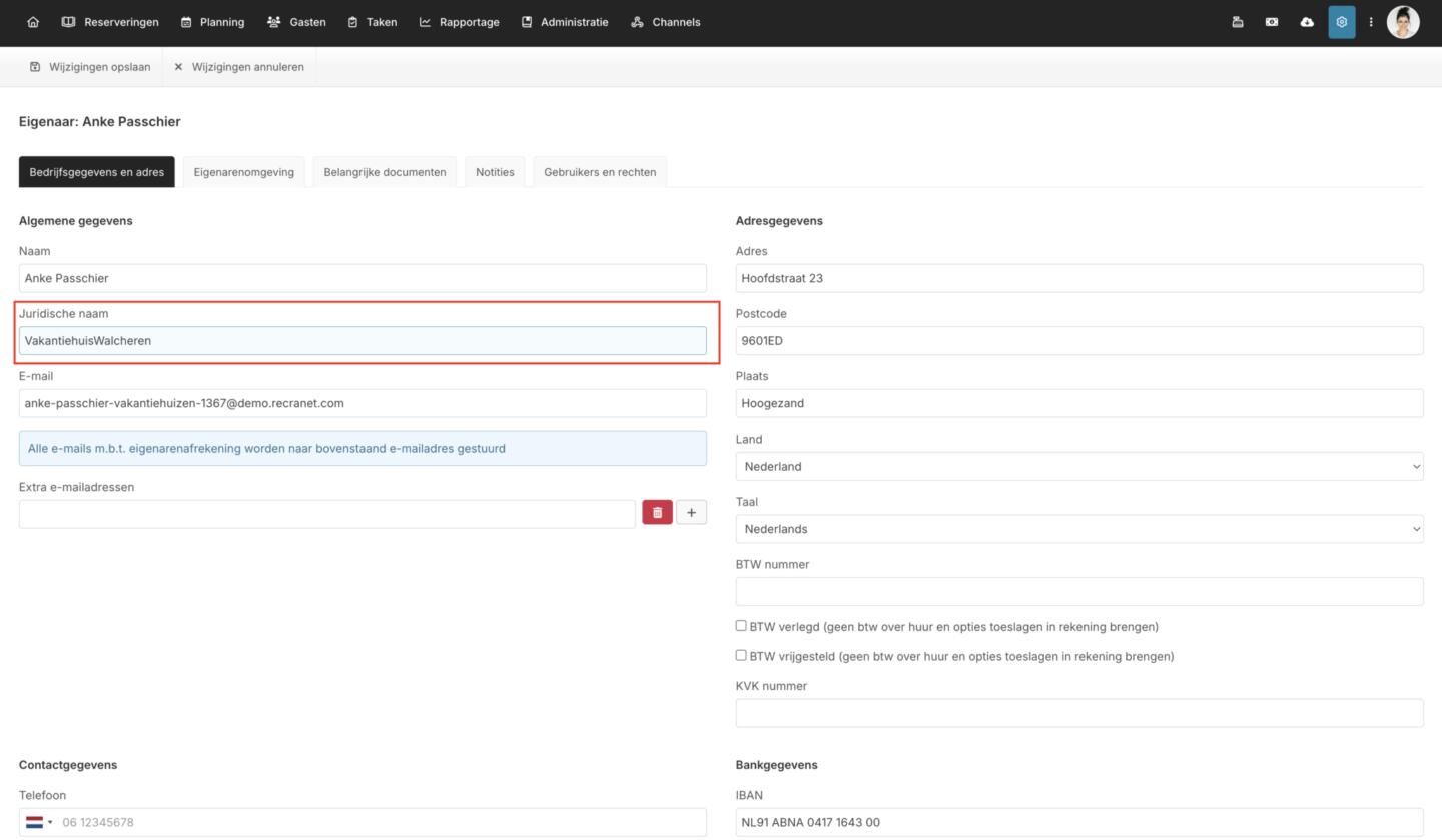 Als het veld Juridische naam is ingevuld, zal het reserveringssysteem automatisch deze naam gebruiken op de afrekening. Is het veld leeg? Dan wordt automatisch de standaard naam van de eigenaar gebruikt.