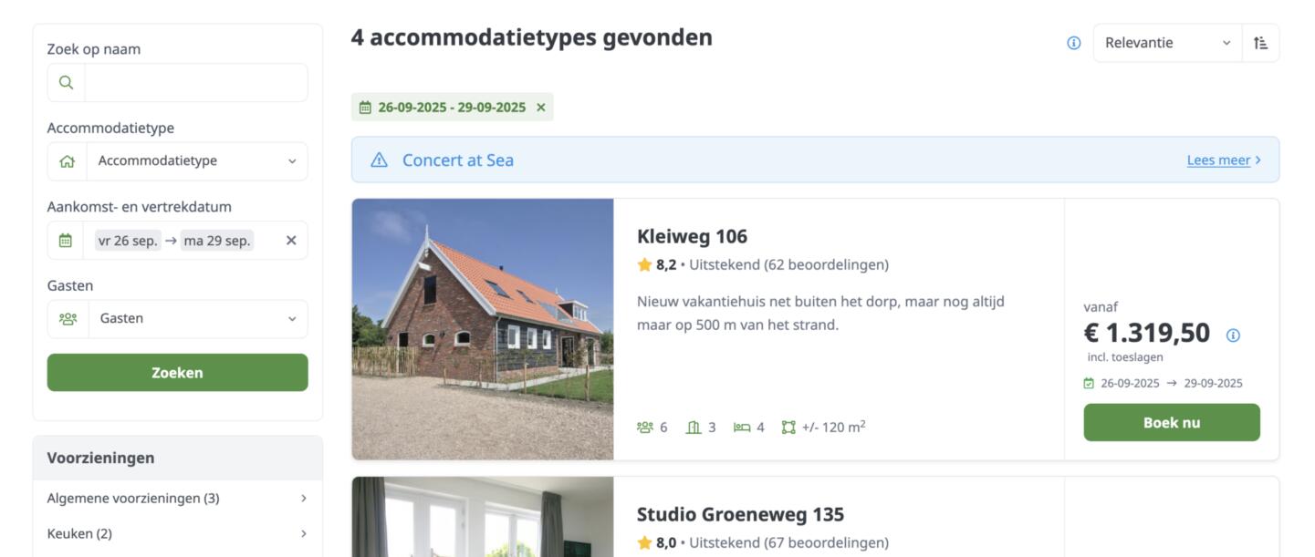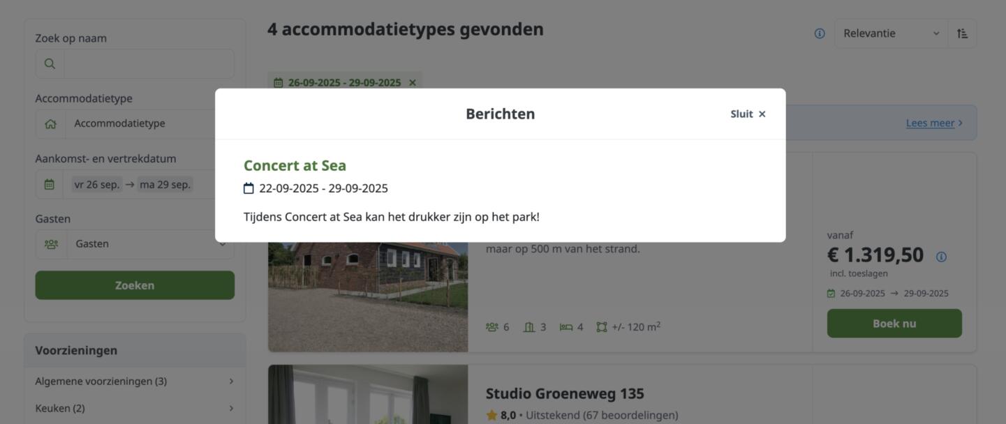 Met deze update kun je nu aankondigingen toevoegen die automatisch verschijnen in de boekingsstraat, op basis van de periode die de gast selecteert. Denk aan aankondigingen zoals "Tijdens Concert at Sea kan het drukker zijn op het park". Je stelt per melding eenvoudig een begin- en einddatum in en bepaalt waar de melding zichtbaar is: boven de zoekresultaten, op de accommodatiepagina of alleen bij specifieke accommodaties.