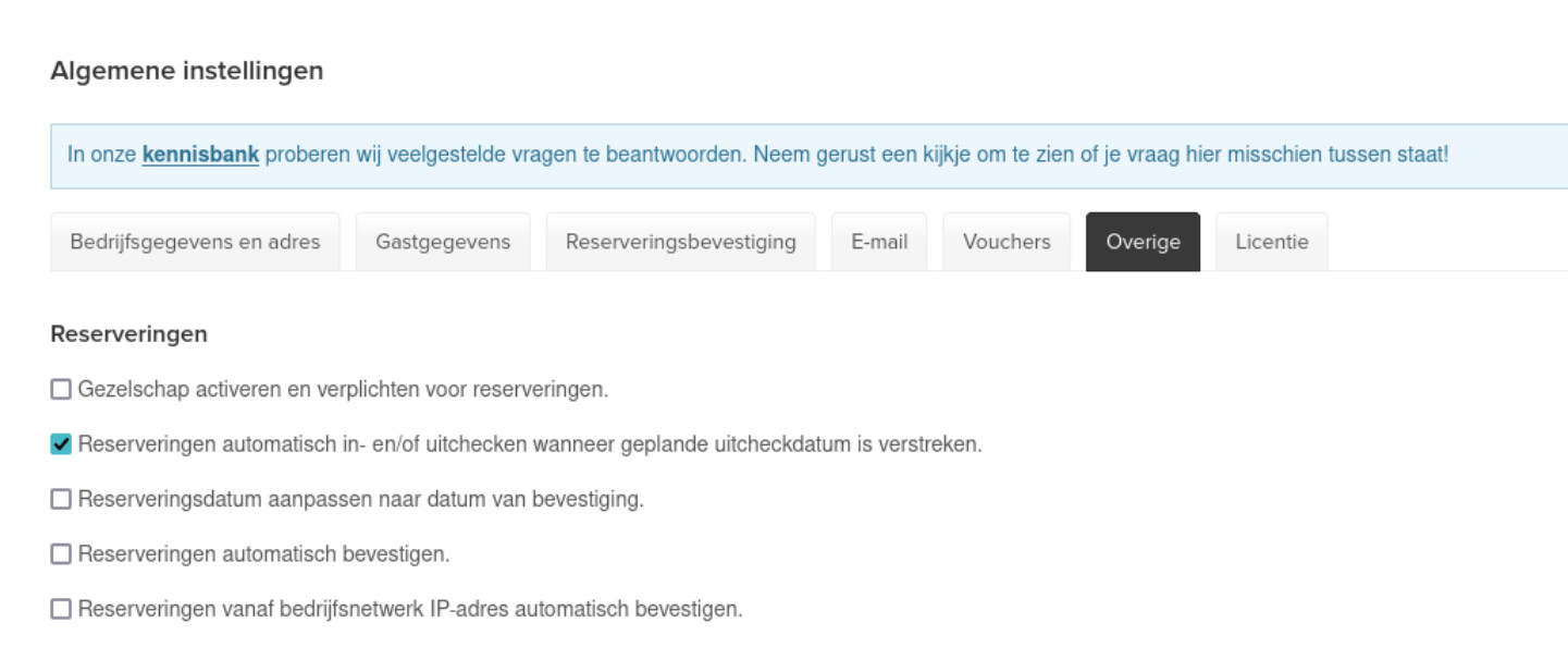 In ons reserveringssysteem is het nu mogelijk om logees automatisch in- en/of uit te checken. Dit kan met de instelling "Reserveringen automatisch in- en/of uitchecken wanneer geplande uitcheckdatum is verstreken".