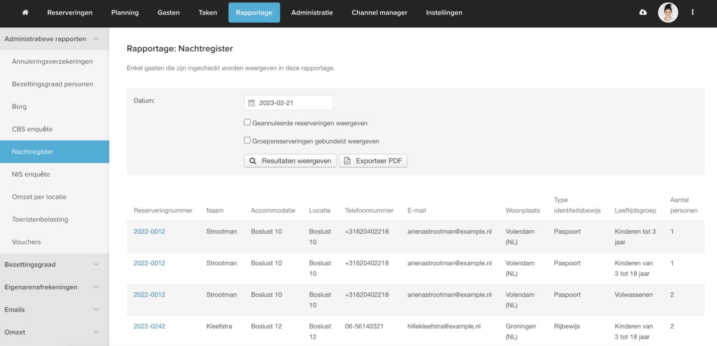 Ook zijn nu de contactgegevens van de gast zichtbaar in het nachtregister, zowel op het dashboard in de tabel, als in het exportbestand. Op deze manier kun je, wanneer nodig, snel schakelen en gasten contacteren wanneer er sprake is van spoed.