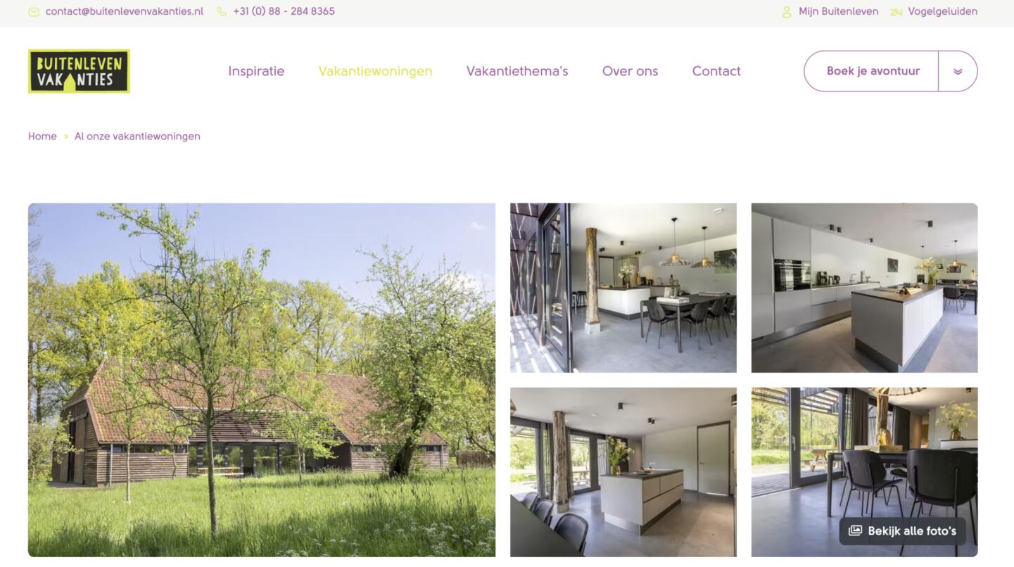 Voor elke accommodatie kun je foto's uploaden welke getoond worden in de zoek & boek. Het design van de fotogalerij op de accommodatie detailpagina is nu vernieuwd, zodat meerdere foto's uitgelicht worden en de bezoeker direct een goed totaalbeeld krijgt van de accommodatie op basis van verschillende foto's. Veelal wordt een foto van het vooraanzicht van de accommodatie zelf als eerste getoond, maar het nieuwe design biedt daarnaast ook meteen een inkijkje in de foto's van indeling en inrichting van de accommodatie.