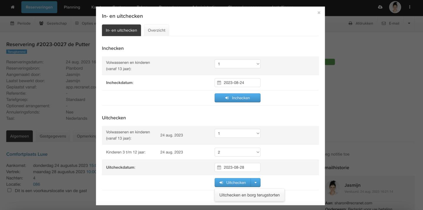 De interface voor het in- en uitchecken van gasten in je reserveringssysteem is geoptimaliseerd. Je kunt gasten direct in- en uitchecken vanuit het overzicht met eerstvolgende aankomsten en eerstvolgende vertrekken, daarnaast kun je ook in- en uitchecken vanuit de reserveringskaart. In beide gevallen geldt dat de interface is geoptimaliseerd: met minder knoppen, kun je nog steeds dezelfde acties uitvoeren. Je ziet in één oogopslag of het gezelschap gedeeltelijk of geheel is ingecheckt en wanneer dit is gebeurd. In dezelfde view kun je het gezelschap uitchecken of een keuze maken om uit te checken en direct borg terug te storten. Daarnaast is er een apart tabblad toegevoegd waarop je het overzicht van je acties terug kunt zien en deze ook weer ongedaan kunt maken, wanneer je dat wenst.