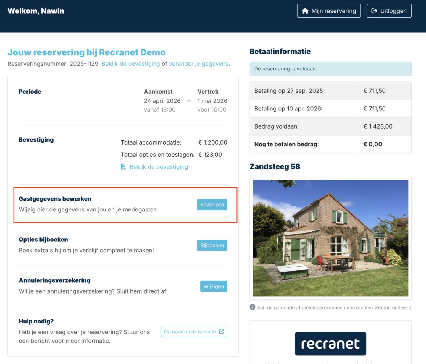 Met deze update is er een nieuwe knop toegevoegd in de gastenomgeving: "Bewerk gastgegevens". Gasten zien in het reserveringsoverzicht zo direct de knop om hun gegevens aan te passen. Deze optimalisatie maakt het meteen helder waar de gast zijn gastgegevens of de gegevens van de medegast aan kan passen, net zoals dit al duidelijk is aangegeven bij opties, toeslagen of de annuleringsverzekering.