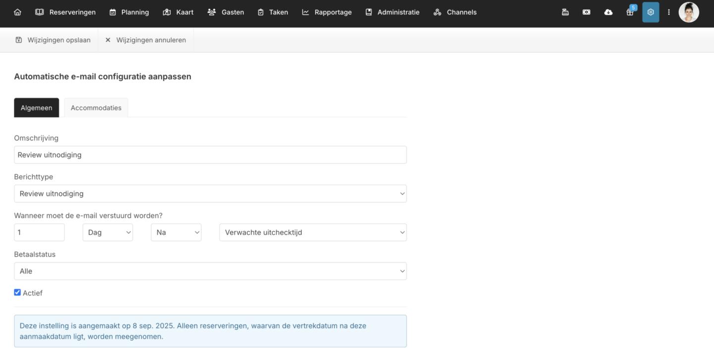 Vanaf nu kun je zelf onbeperkt automatische e-mailberichten aanmaken en versturen vanuit het reserveringssysteem. Het was al mogelijk om transactionele mails, zoals aankomstmail, vertrekmail, betalingsherinnering etc. geautomatiseerd te versturen, maar je kunt nu dus ook andere, specifieke mailberichten opstellen en met een door jou te bepalen frequentie automatisch versturen. Je kunt de mails helemaal naar wens instellen en bepalen wanneer een specifieke mail verstuurd wordt naar de gast. Ook kun je hierbij instellen dat de mail bijvoorbeeld alleen verstuurd wordt naar gasten die al betaald hebben รณf de mail juist alleen versturen naar gasten met een reservering waarvoor nog een bedrag openstaat.