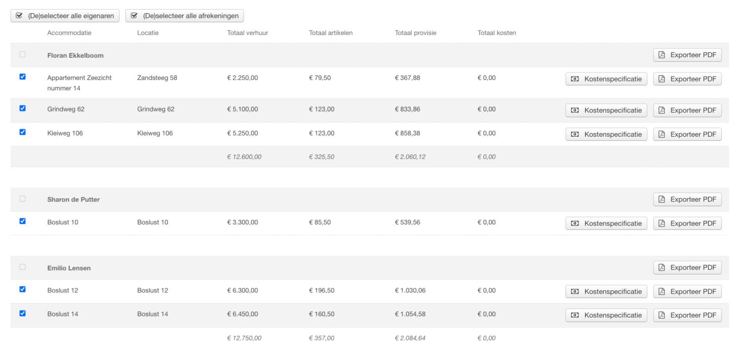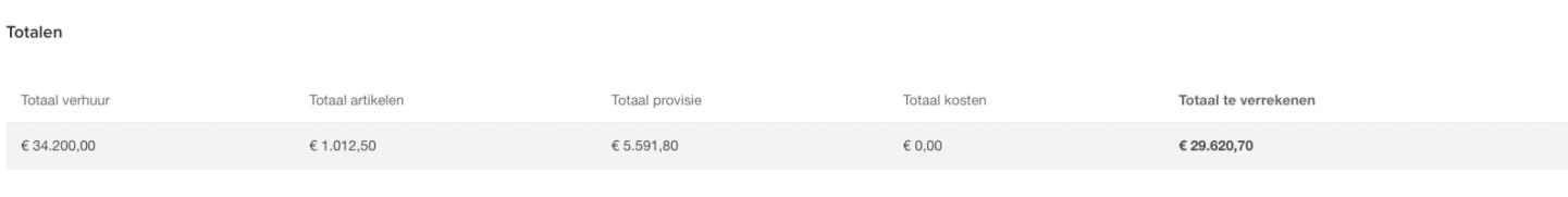 Wanneer je periodiek gaat afrekenen aan eigenaren, kun je nu gemakkelijk zien wat het totaal af te rekenen bedrag is. Voor eigenaren met meerdere eenheden zie je wat afgerekend wordt per eenheid, maar ook wat totaal afgerekend wordt aan de eigenaar. Daarnaast wordt een totaal getoond van omzet verhuur plus omzet artikelen, minus provisie, zodat je in één oogopslag kunt zien wat het totaal is van alle af te rekenen eigenaren tezamen.