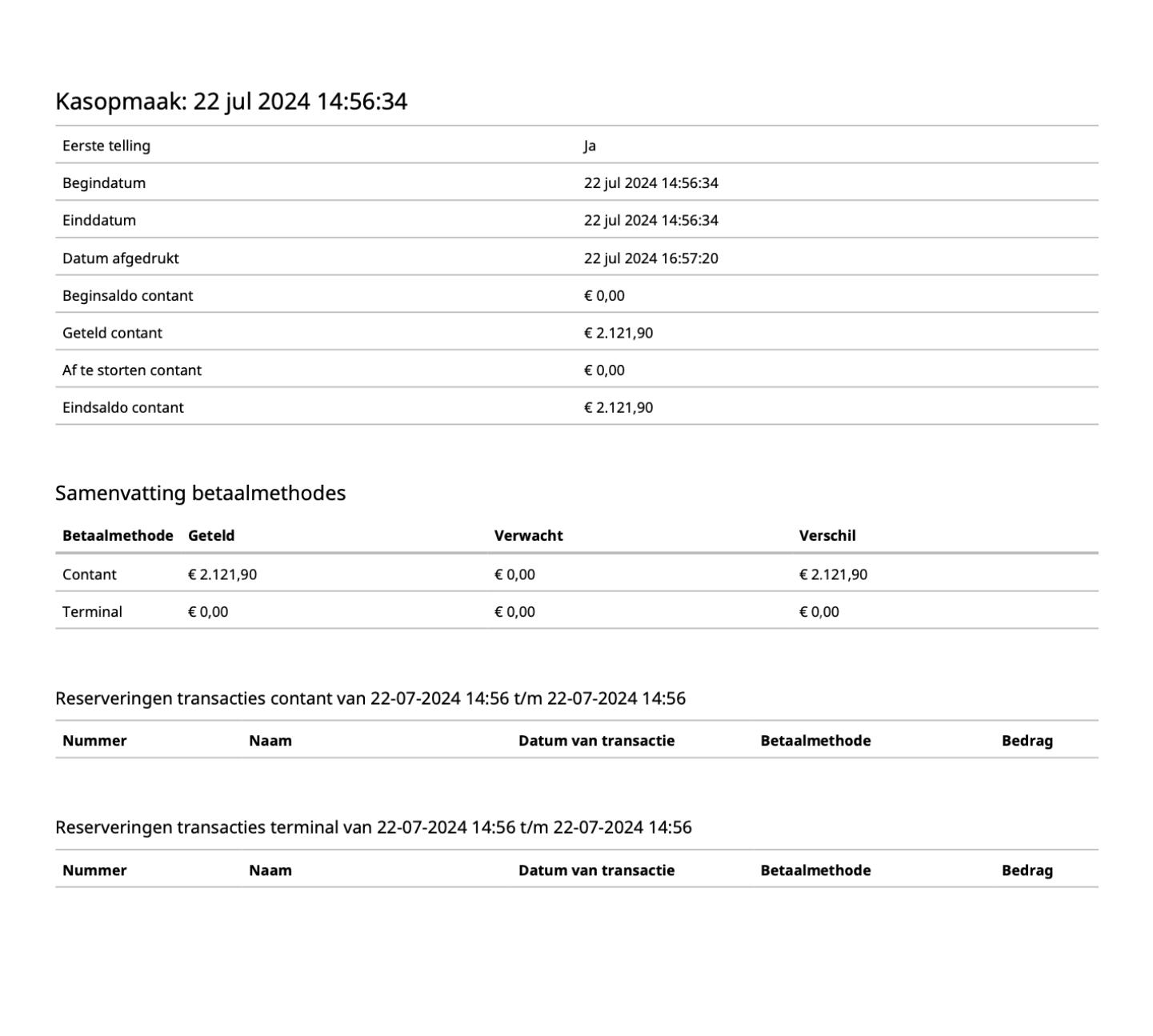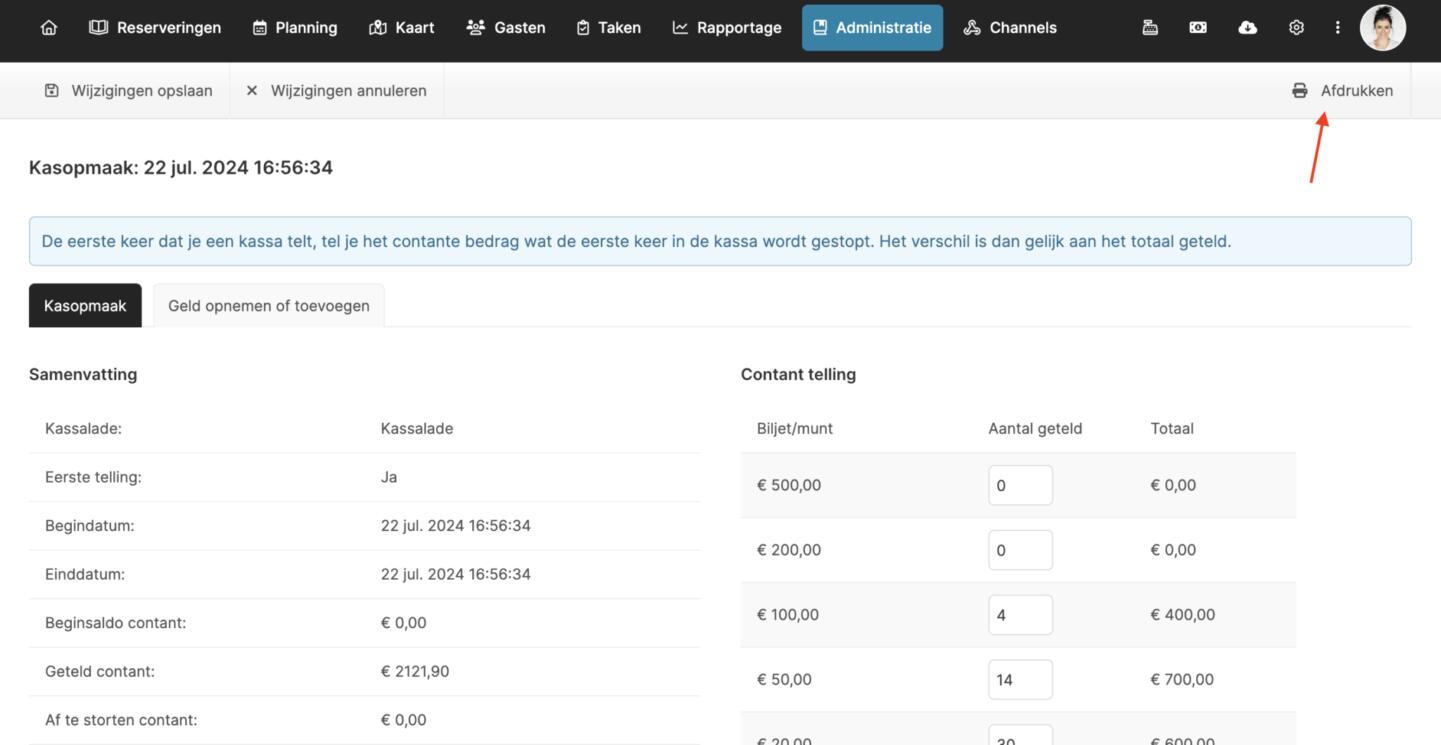 Voor elke kasopmaak die je afrondt in je reserveringssysteem, kun je nu een overzichtelijk en afdrukbaar PDF bestand genereren. De kasopmaak kun je vinden onder Administratie > Kasopmaak. Hier kun je vervolgens zoeken in een bepaalde periode naar de momenten waarop je de kas hebt opgemaakt en vervolgens kun je per kasopmaak een overzichtelijk PDF genereren en afdrukken.