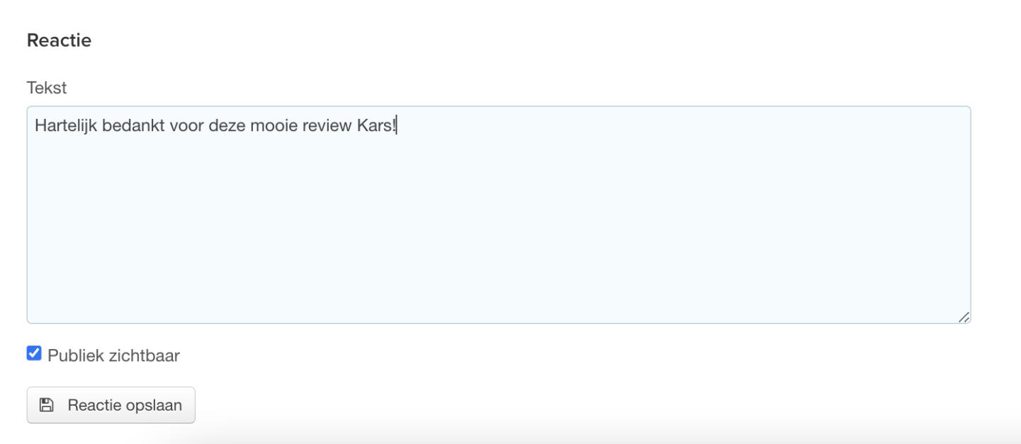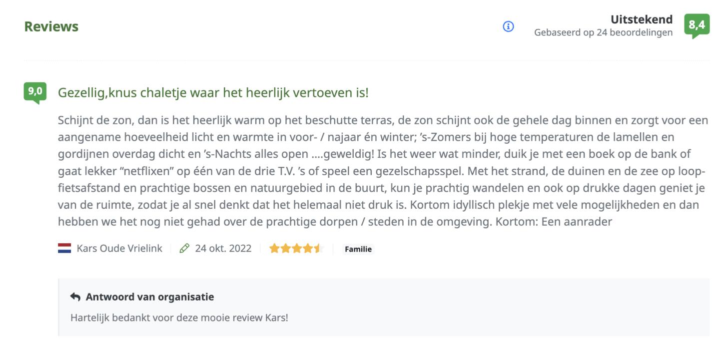 Het was al langer mogelijk om een reactie te geven op een ontvangen review. De gast ontvangt hiervan een melding en kan de reactie lezen in de gastenomgeving die enkel voor de gast toegankelijk is. In sommige situaties kan het juist ook van toegevoegde waarde zijn als de door jou geschreven reactie op een review ook publiekelijk zichtbaar is, zodat ook andere (potentiële) gasten mee kunnen lezen. Zo kun je inhoudelijk reageren op feedback en tips of juist hartelijk bedanken voor een mooi compliment. Vanaf nu is het dus ook mogelijk om optioneel reacties op reviews online te tonen in de boekingsstraat op je website. Je kunt voor elke reactie zelf aanvinken of deze publiekelijk zichtbaar mag zijn of niet. Dit kun je instellen via Instellingen > Account > Reviews. Wanneer je een review opent en bekijkt, kun je ook een reactie schrijven en eventueel publiceren.