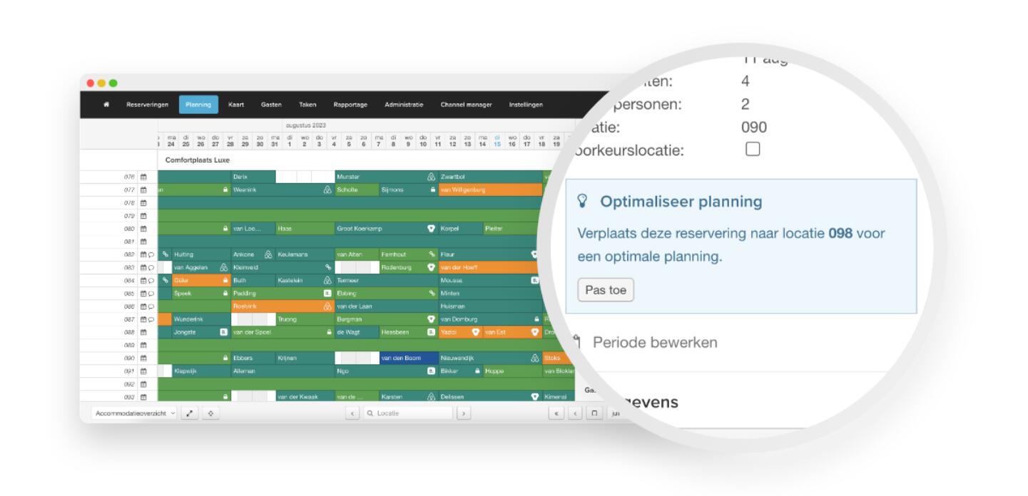Met name voor campings/parken die veel soortgelijke accommodaties/plaatsen verhuren werkt deze functionaliteit perfect, omdat je full focus bezig bent met efficiënt en strak plannen zonder dat het voor de gast uitmaakt op welke plek / in welk huisje ze terechtkomen. Wanneer je werkt met het boeken van voorkeurslocaties wordt het lastiger, omdat je hier beperkt wordt door de keuze die de gast gemaakt heeft bij het online reserveren. In overleg met de gast kun je altijd besluiten alsnog te wisselen van plek, als het planbord een slimmere suggestie geeft.