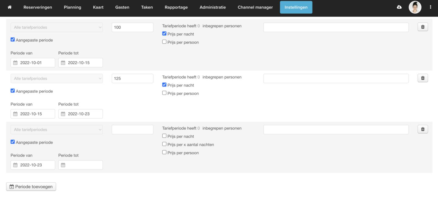 Wanneer je in ons reserveringssysteem tarieven per periode invoert, zorgt het systeem er automatisch voor dat elke volgende periode start op de einddatum van de voorgaande periode. Deze handigheid zorgt ervoor dat tariefperiodes altijd op elkaar aansluiten en er geen gaten kunnen ontstaan in je tariefstructuur door een mogelijke menselijke fout. Meer efficiëntie, minder foutgevoeligheid!