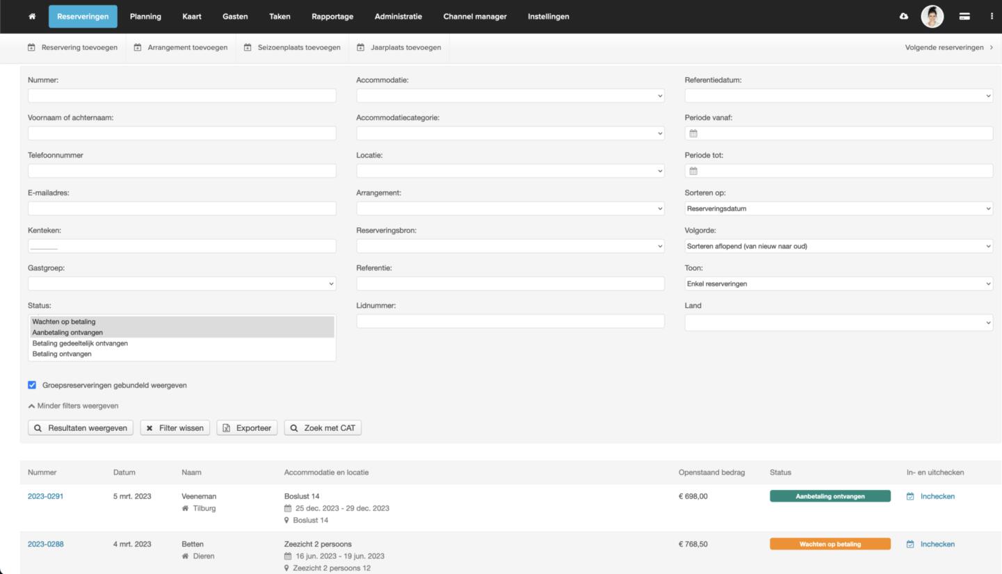 Het overzicht van reserveringen in je Recranet Booking account kun je filteren op allerlei verschillende items. Denk aan gastnaam, accommodatie, verblijfsdatum, reserveringsbron, gastgroep, lidnummer etc. We hebben nu ook de mogelijkheid toegevoegd te kunnen filteren op basis van de status van een reservering. Denk hierbij bijvoorbeeld aan status 'geannuleerd' of status 'geweigerd', 'betaling ontvangen' of 'optie verlopen'. Hierdoor kun je nog meer gerichte exports genereren en gemakkelijk specifieke reserveringen terugvinden op basis van de status.