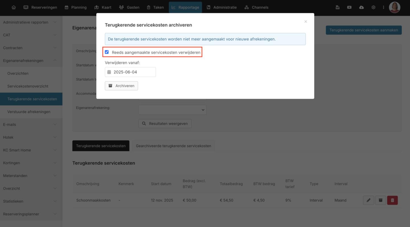 Vanaf nu kun je bij het archiveren van terugkerende servicekosten direct aangeven of je deze kosten ook wilt verwijderen uit bestaande reserveringen.