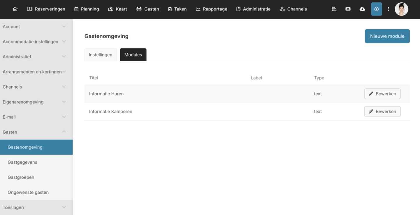 Om gasten te voorzien van praktische informatie over hun reservering of mogelijkheden te bieden tot het bijboeken van bijvoorbeeld fietsen, broodjes etc., kun je zelf modules (bijvoorbeeld in een iframe) toevoegen welke zichtbaar worden in de gastenomgeving. Je kunt deze modules nu koppelen aan specifieke accommodaties, waardoor het mogelijk wordt aparte informatie te tonen afhankelijk van de accommodatie die de gast geboekt heeft. Met name het verschil tussen kampeerplaatsen en verhuur accommodaties zorgt ervoor dat je andere informatie wilt verstrekken of andere modules beschikbaar wilt maken voor gasten.