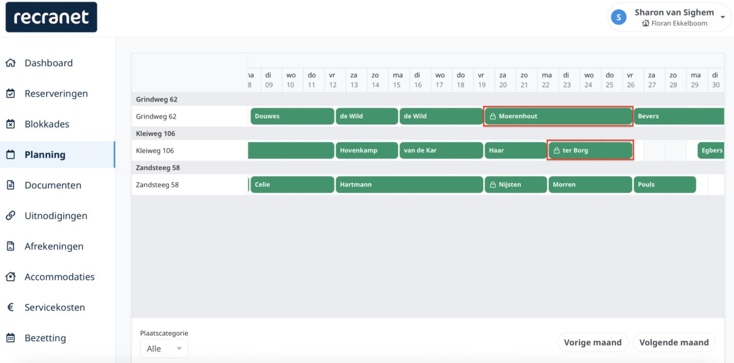 Wanneer een gast een voorkeurslocatie kiest bij het online boeken, verschijnt er automatisch een slotje vóór de reserveringsnaam in het planbord van de eigenarenomgeving. Vooral voor eigenaren die meerdere locaties verhuren is dit een waardevolle toevoeging. Zo weet de eigenaar in één oogopslag dat deze reservering op een vaste plek moet blijven staan. Dit voorkomt misverstanden en zorgt voor een duidelijke, gebruiksvriendelijke planning.