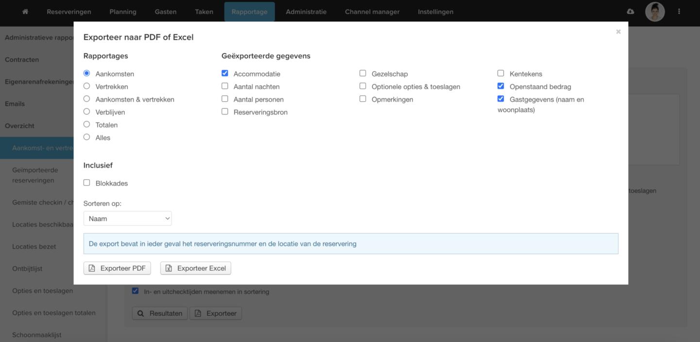 De aankomst- en vertreklijst in ons reserveringssysteem is breed inzetbaar voor inzage in aankomsten, vertrekken en verblijven, maar bijvoorbeeld ook als schoonmaaklijst, ontbijtlijst, overzicht van bijgeboekte opties etc. Je kunt deze lijst nu nog flexibeler samenstellen door het pop-up venster te gebruiken en aan te klikken welke informatie je mee wilt nemen in je exportbestand. Deze mogelijkheid bestond al voor het exporteren in PDF, maar is nu ook mogelijk voor het exporteren in Excel. Deze toevoeging zorgt ervoor dat de aankomst- en vertreklijst voor iedereen bruikbaar en voor vrijwel elke werkwijze toepasbaar is, omdat je zelf kunt bepalen welke reserveringsinformatie je wilt terugzien in het te exporteren bestand.
