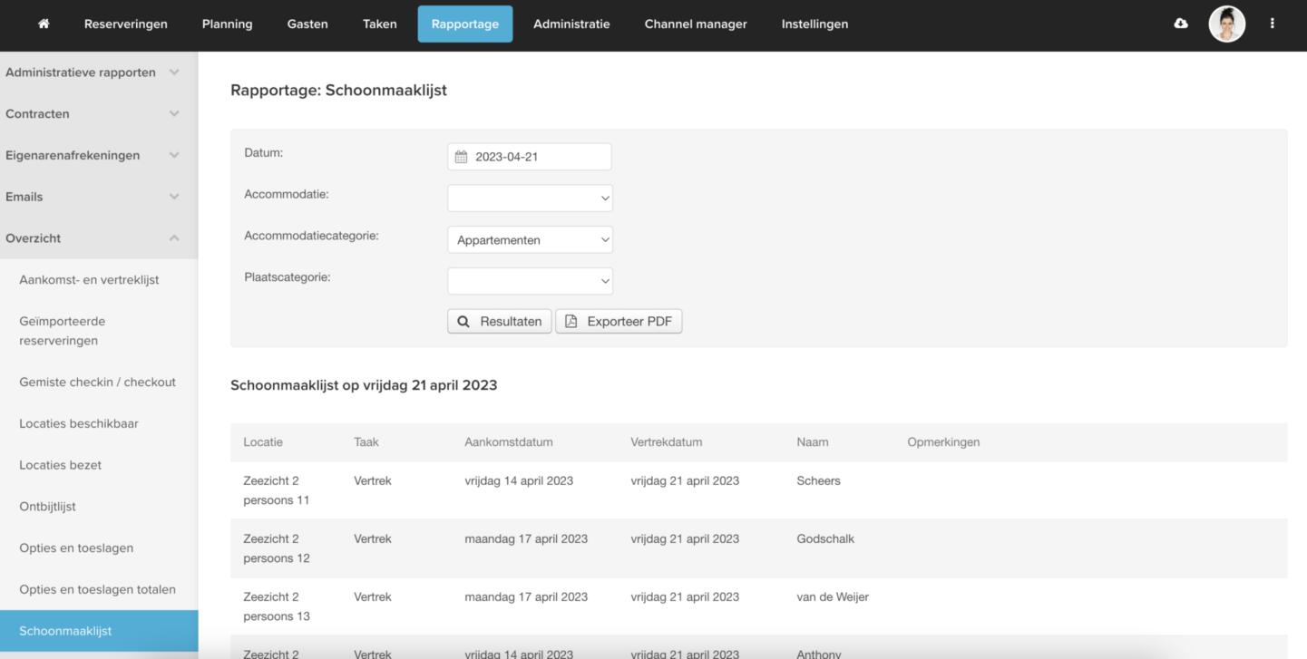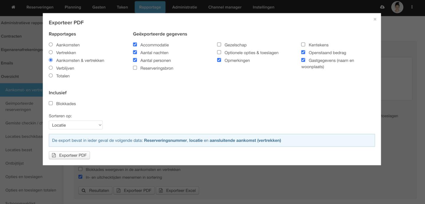Wil je meer mogelijkheden om zelf een schoonmaak- of ontbijtlijst naar wens uit te draaien? Dan biedt de aankomst- en vertreklijst heel veel opties, waarbij je zelf kunt kiezen wat je in je rapportage wilt exporteren.