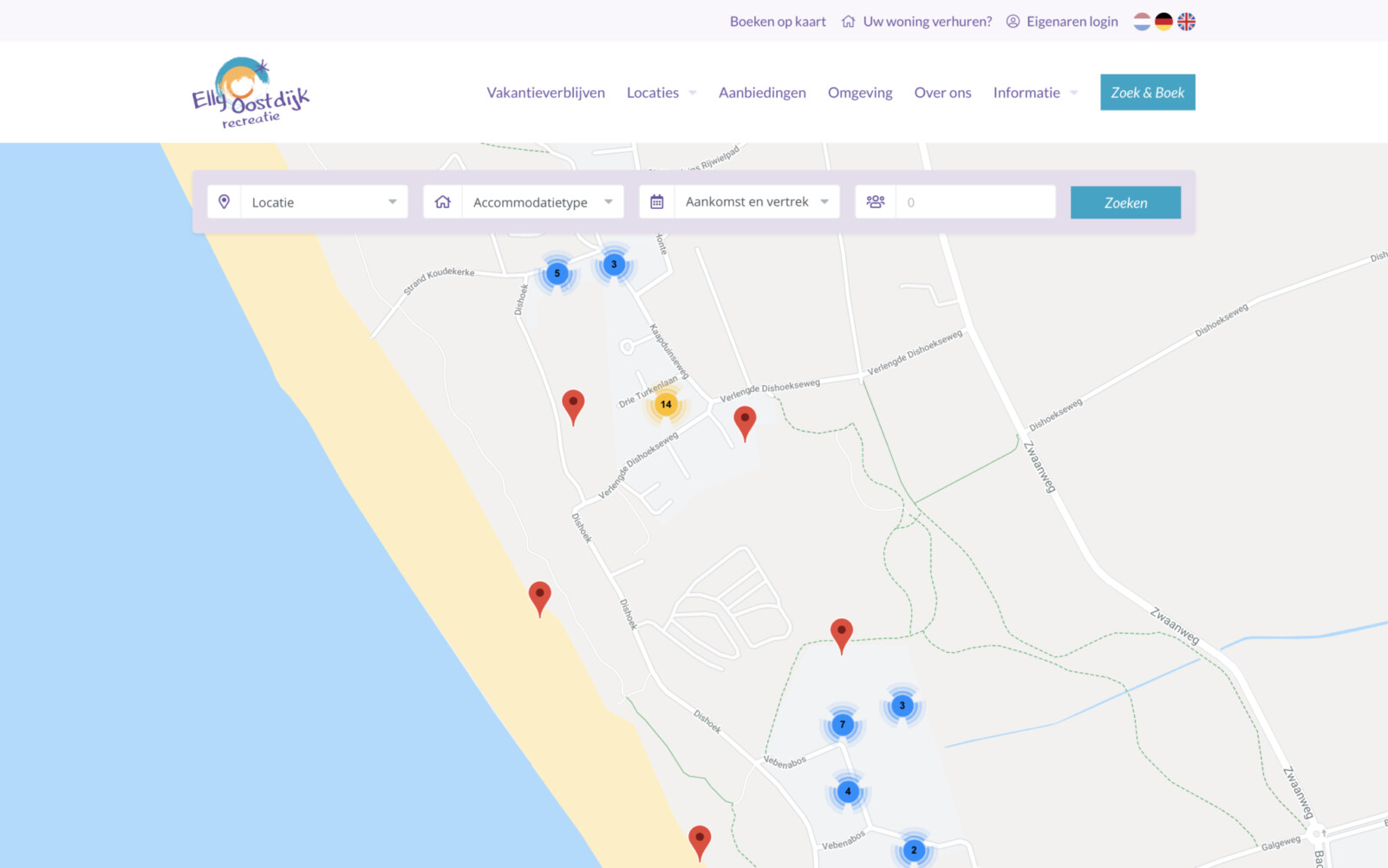 Ja, de zoek en boek van ons reserveringssysteem is volledig aan te passen aan de stijl van je website. Je gast wordt niet naar een externe website gestuurd; het volledige online boekingsproces gebeurt op de site van je vakantiepark, die wij over het algemeen maken. Bijkomend voordeel is dat ons reserveringssysteem op de juiste wijze geïntegreerd wordt in de website van je vakantiepark zodat Google de pagina’s ook indexeert.
