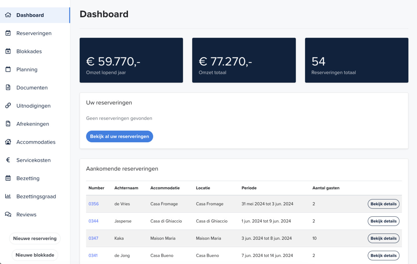 Zorg altijd voor actuele content als verhuurder door zelf je accommodatie afbeeldingen en content te beheren. Pak de aandacht door de juiste styling toe te passen. Lees beoordelingen van gasten die zij achter laten voor jouw accommodaties. En maak als eigenaar zelf reserveringen aan voor je eigen verblijf of voor anderen.