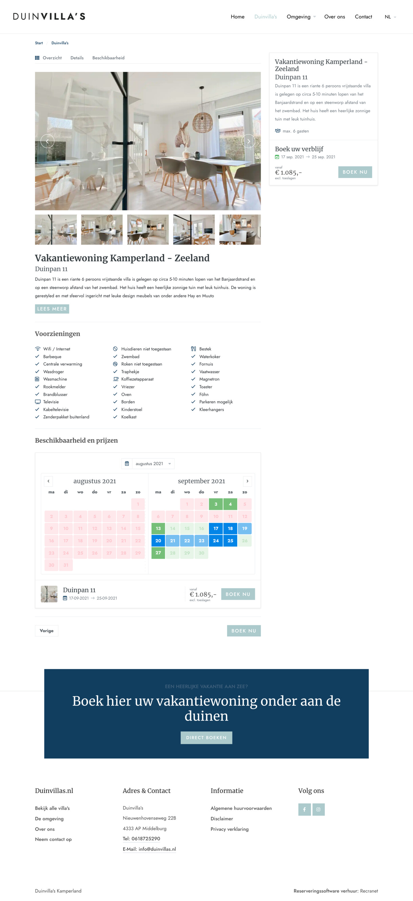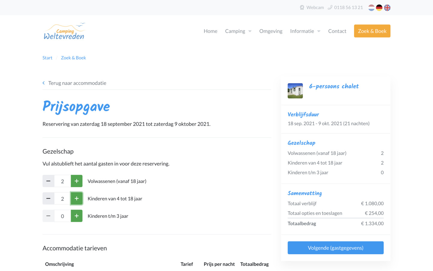 Je gasten krijgen in het reserveringssysteem een heldere en volledige prijsopgave te zien. Hierbij zien zij welke tarieven gelden voor de geselecteerde periode. Arrangementen en kortingen worden automatisch berekend in de prijsopgave. Opties zoals een extra auto of huisdier zijn eenvoudig toe te voegen.
